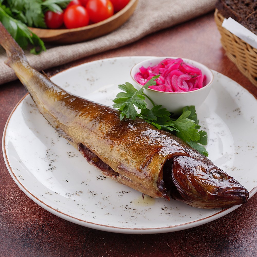 Рыба форель, рассол для копчения (вода, соль, сахар, специи перец черный, специи перец душистый, специи лавровый лист, специи гвоздика), лук маринованный (лук репчатый, вода, уксус, свекла, сахар, зелень, соль), масло подсолнечное, масло сливочное.