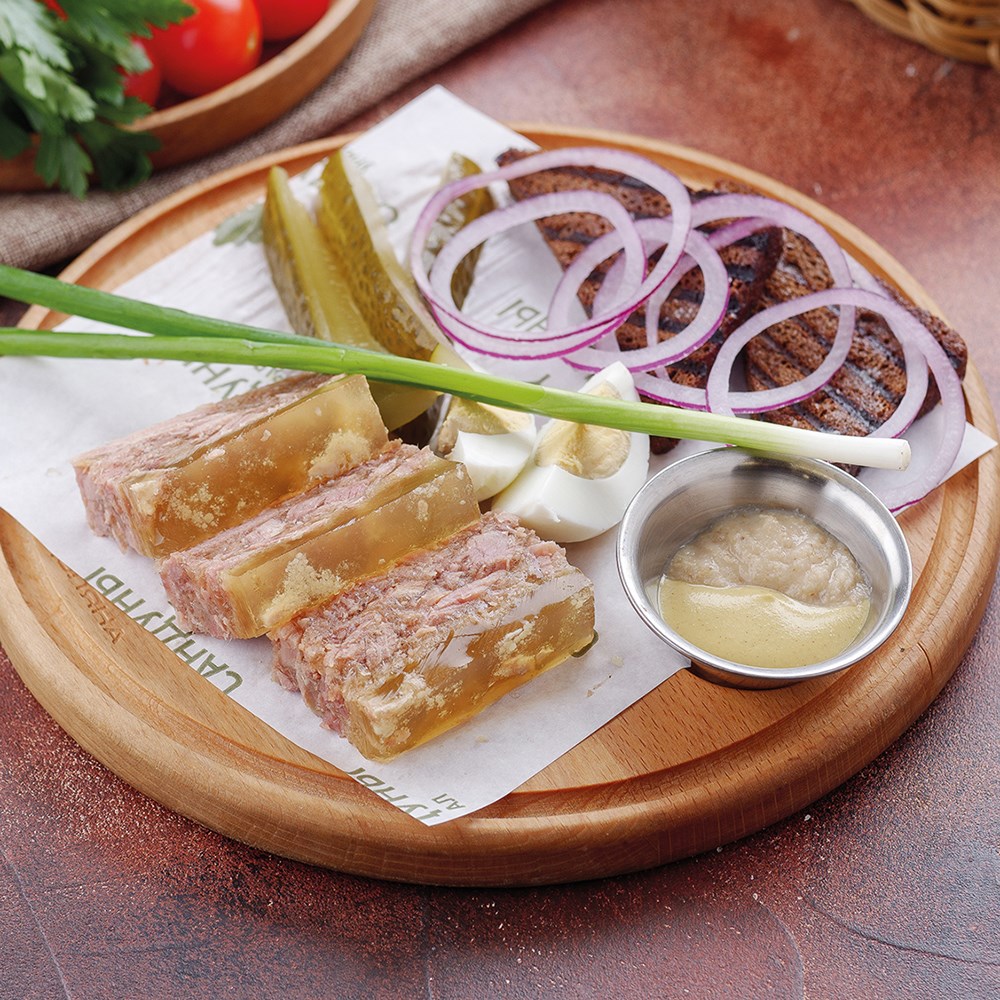 Холодец из говядины, подается со сливочным хреном, горчицей, яйцом, красным и зеленым луком, с солеными огурчиками и хлебом бородинским на гриле.