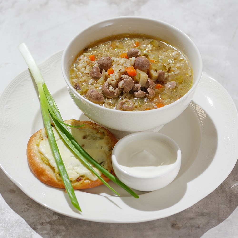 Бульон говяжий (вода, кости говяжьи пищевые, лук репчатый, морковь, перец душистый, перец черный горошком, лавровый лист, соль), лук репчатый свежий, морковь свежая, грибы белые свежемороженные, крупа перловая, огурец маринованный (вода, соль, сахар, специи, уксус, семена горчицы, лимонная кислота), почки кролика, масло растительное, соль, перец черный молотый, лук зеленый, шаньга с картофелем (мука пшеничная, вода, соль, сахар, яйцо, маргарин, масло растительное, дрожжи сухие, молоко, картофель, сметана).