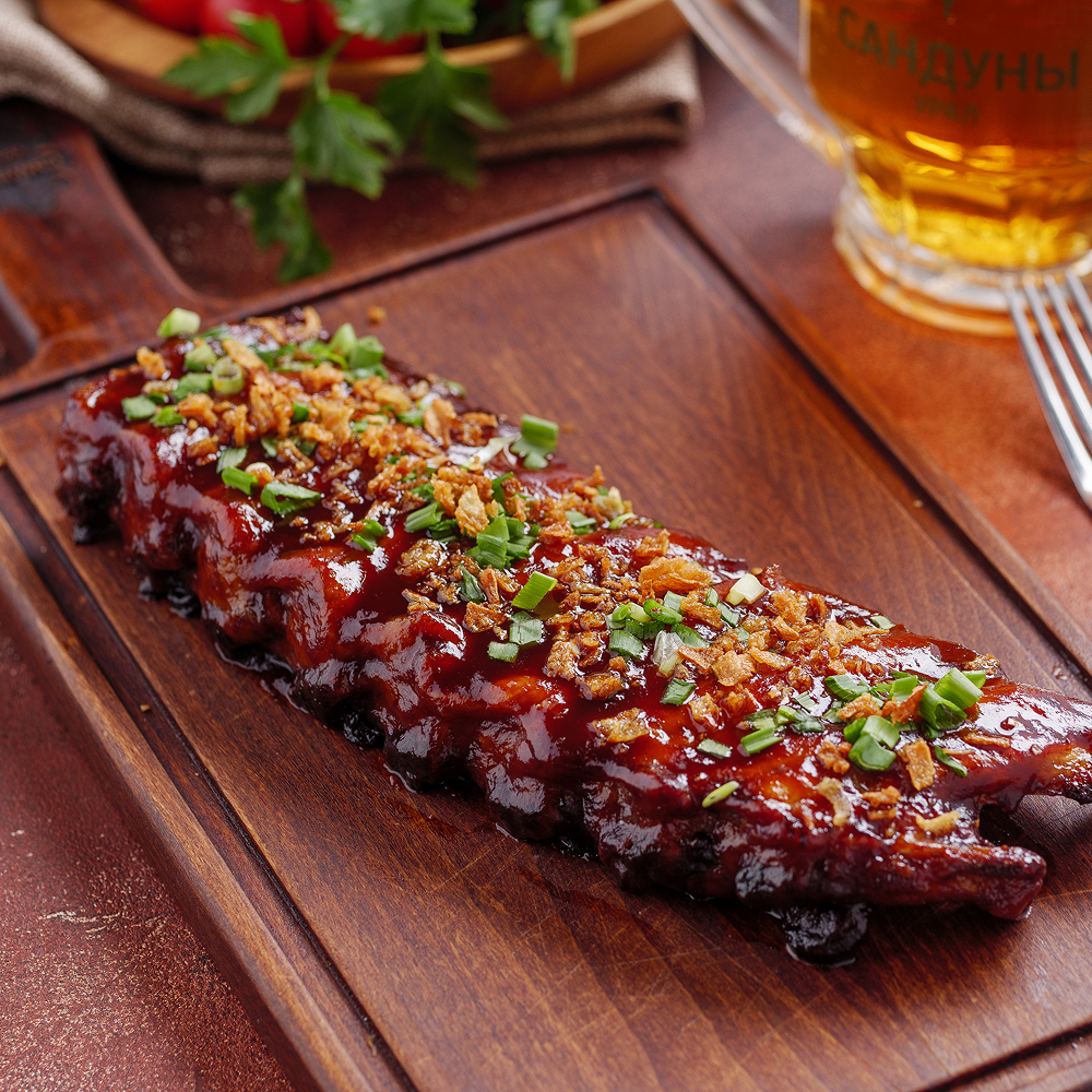 Ребра свиные, соус соевый, имбирь корень, масло кунжутное, чеснок, зелень, бадьян, перец черный.
