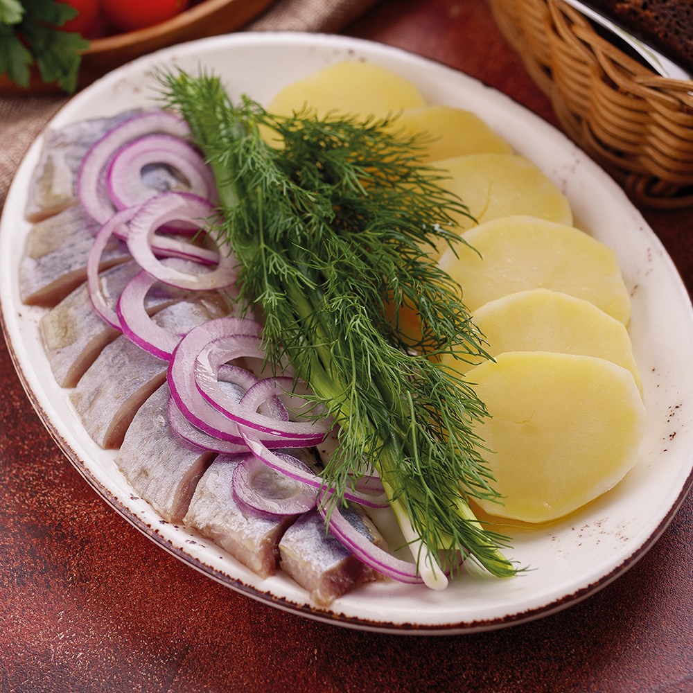 Сельдь слабосоленая , картофель отварной, масло подсолнечное, лук зеленый, зелень.