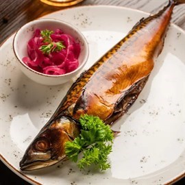 Рыба скумбрия, рассол для копчения (вода, соль, сахар, специи), лук маринованный (лук репчатый, вода, уксус, свекла, сахар, зелень, соль), масло подсолнечное, масло сливочное.