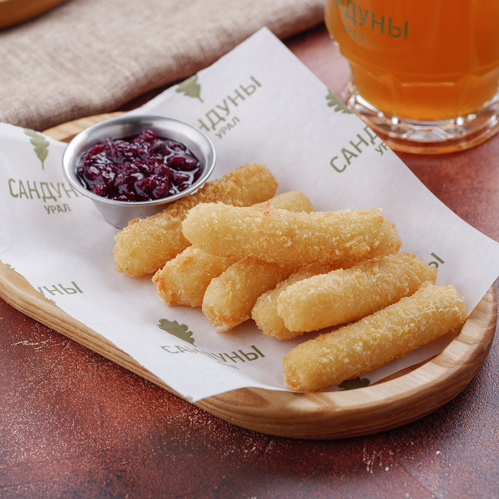 Сыр рассольный, яйцо куриное, хлопья пшеничные, мука пшеничная, соус брусничный.